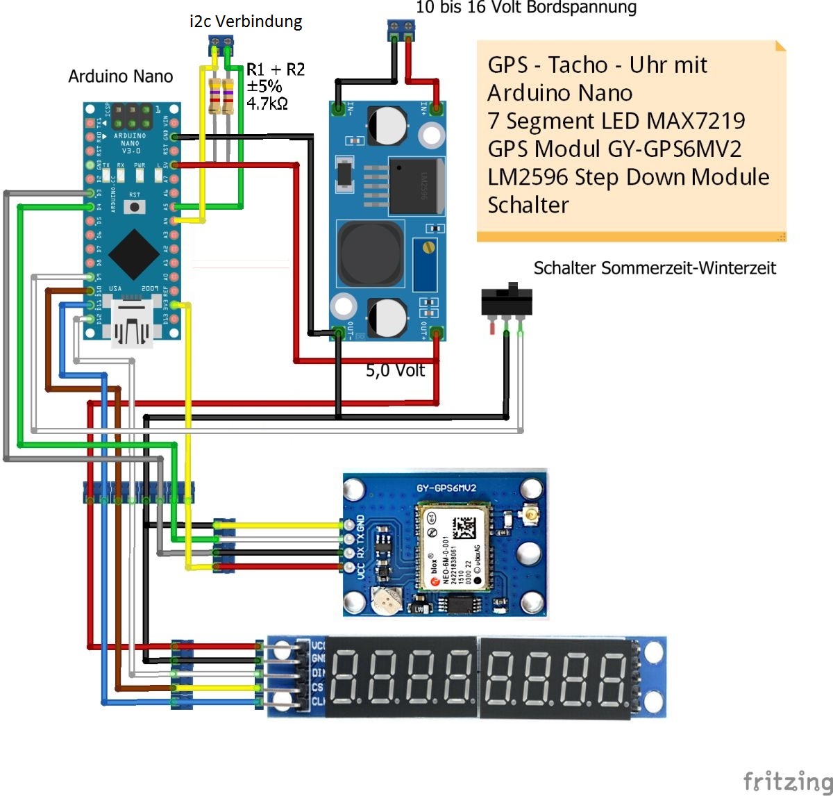 | Hallo zusammen, wie viele Oldtimerfahrer auch schalte ich nach dem Abstellen meines Saporoshez 968 in der Garage die Batterie ab. Das Entladen der Batterie über Tage und Wochen wird damit vermieden bzw. stark verzögert. Die Folge ist jedoch, dass normale elektrische Uhren im Auto in dieser Zeit stehen bleiben. Eine der möglichen Lösungen für dieses Problem ist eine Uhr, die sich automatisch nach den GPS Satelliten einstellt. GPS Satelliten senden allerdings die UTC-Zeit. Für eine Uhr in Mitteleuropa muss zu dieser UTC Zeit bei Winterzeit 1 Stunde, bei Sommerzeit 2 Stunden dazu addiert werden. Mit Hilfe von GPS Satelliten kann man nicht nur die UTC-Zeit, sondern auch die relative Geschwindigkeit ermitteln, in meinem Fall in Kilometer pro Stunde. Es bietet sich somit an, mit den vorhandenen Bauteilen direkt eine kombinierte Uhr mit Tacho zu bauen. In der Praxis zeigt sich, dass nach etwa 20 Sekunden nach Verlassen der Tiefgarage eine Uhrzeit angezeigt wird, bis zur ersten Anzeige eines KMH-Signals vergehen etwa 3 Minuten. Die Berechnungen übernimmt ein Arduino Nano, das GPS-Signal wird von einem GPS6MV2 Modul empfangen und die Ziffern werden von einer schön rot leuchtenden 7Segment LED-Anzeige mit Max7219 Ansteuerung angezeigt. Der Arduino wird von einem Spannungswandler Modul LM2596 zuverlässig mit 5 Volt versorgt. Diese 4 Bauteile kann man bei einem Onlinehändler in Deutschland für etwa Euro 20,00 bestellen. Im Saporoshez wird der Arduino Nano zusammen mit dem LM2596 Modul im Armaturenbrett bzw. hinter der Regelung für die elektrische Choke-Betätigung versteckt. Das kleine Modul mit der GPS-Antenne findet noch Platz im Inneren des Drehzahlmessers, nun führen statt 4 Litzen insgesamt 8 Litzen aus dem Drehzahlmesser in das Armaturenbrett. Die 7Segment LED-Anzeige wird, unter einem schwarz lackierten Alu-Winkel geklebt, in den Spalt zwischen Instrumententräger und Armaturenbrett geklemmt. Der über das GPS empfangene Wert kmh wird mit der Verbindungsart i2c über zwei Kabel an den Tachorechner gesendet. Im Tunnel schaltet sich der GPS Tacho nach 2 Sekunden aus.