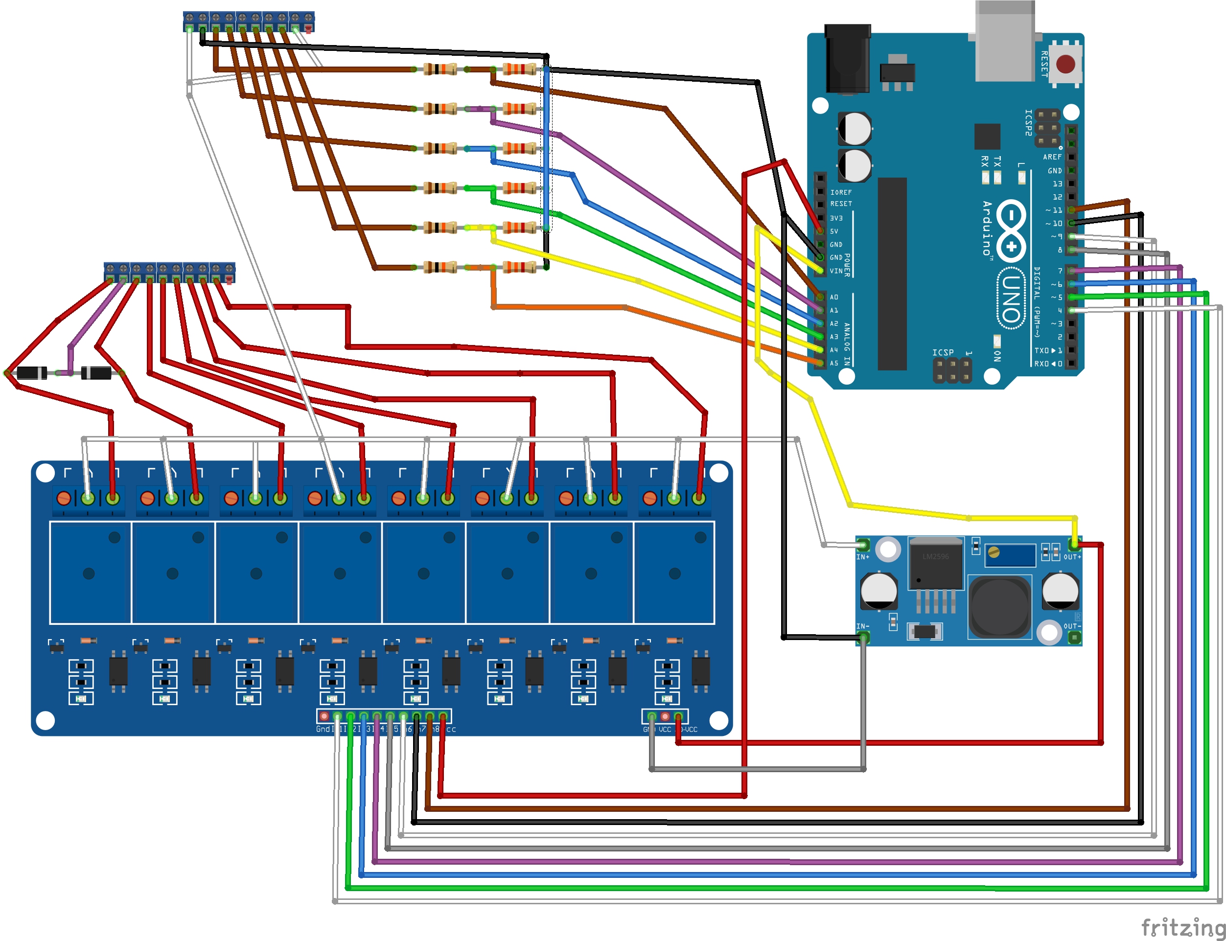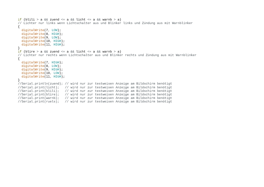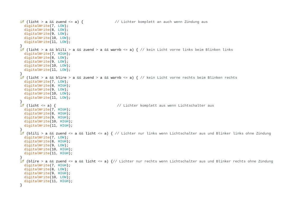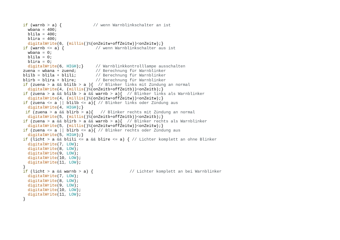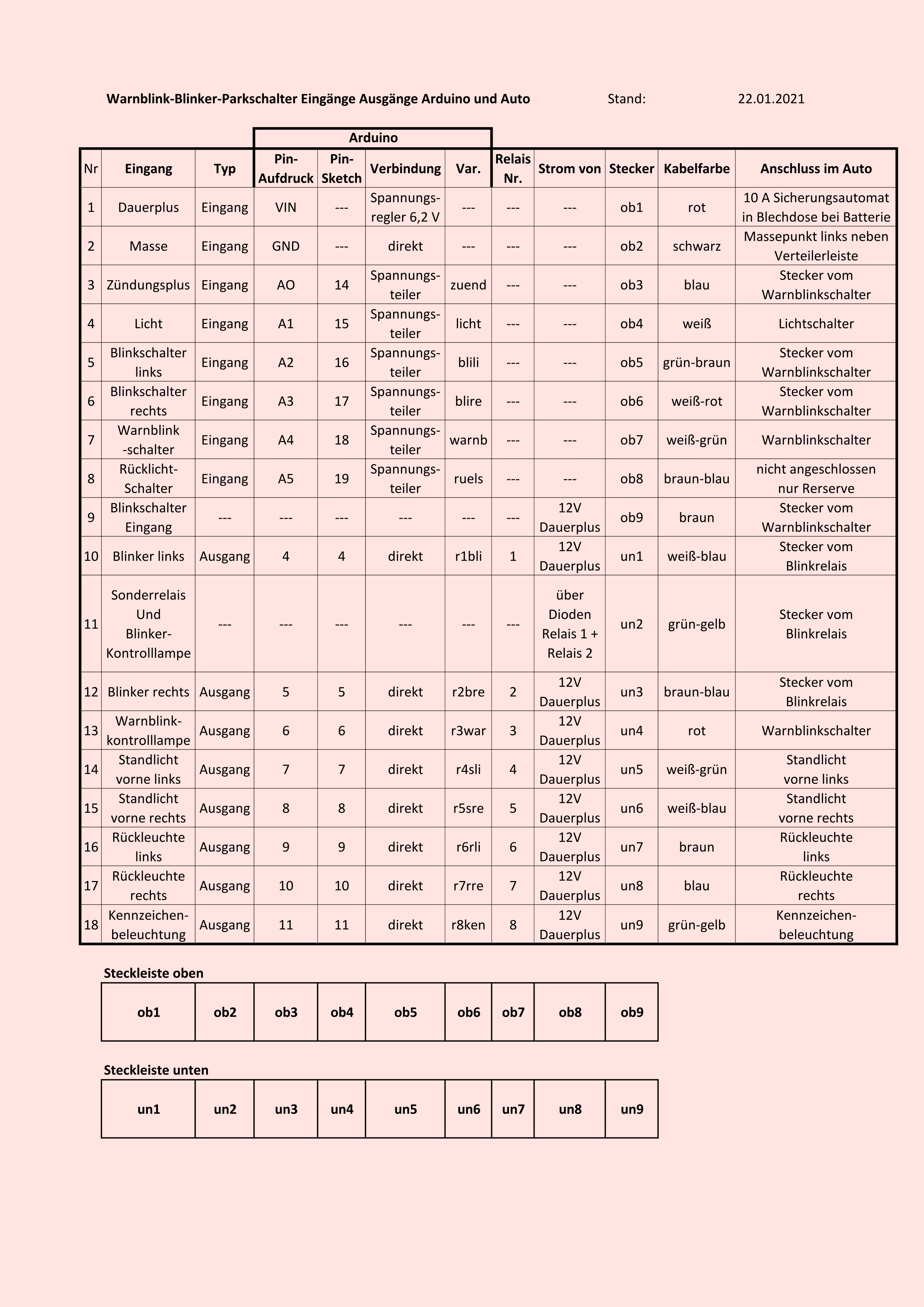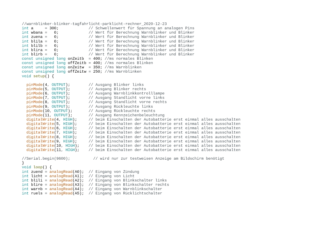 | Hallo zusammen, einfach aus Spaß habe ich auf Grundlage eines Arduino Uno für meinen Saporoshez 968 einen Warnblinker-Blinker-Tagfahrlicht-Parklicht-Rechner gebaut. Der alte Opel Rekord D meines Vaters hatte eine so genannte Parklichtschaltung: Abhängig von der Stellung des Blinkerhebels leuchtete, wenn ansonsten das Licht und Zündung aus waren, entweder nur das linke oder das rechte Standlicht. So etwas wollte ich haben. Und bei manchen neuen Autos wird, damit das vordere Standlicht/Tagfahrlicht den Blinker nicht überstrahlt, dieses Licht beim Blinken rechts bzw. links abgeschaltet. So etwas wollte ich auch haben.