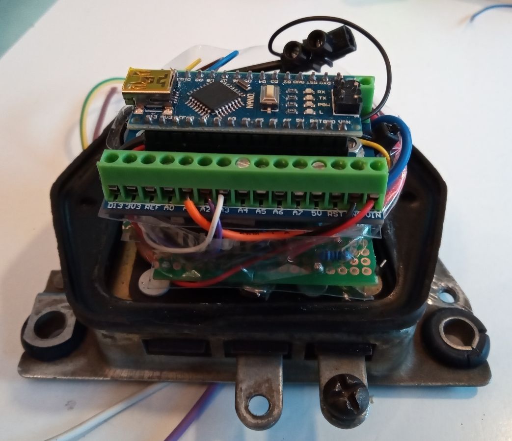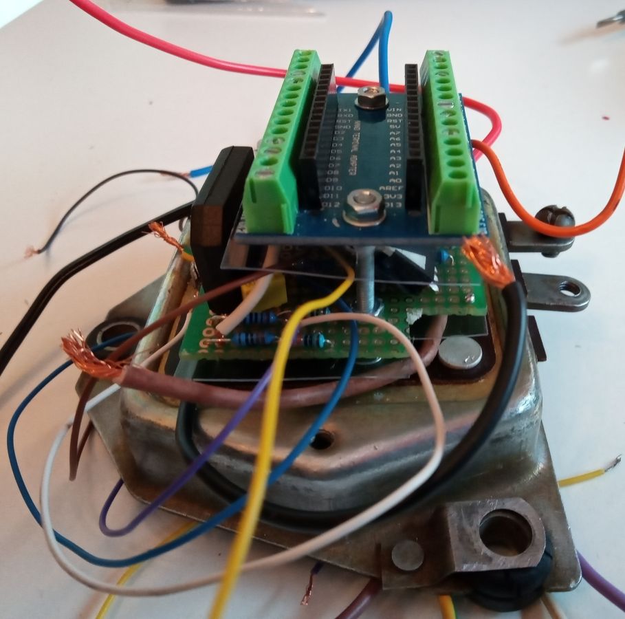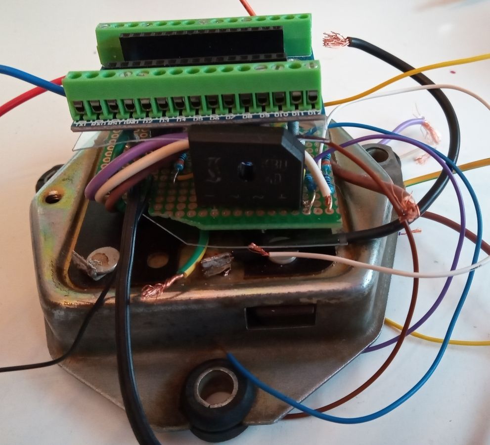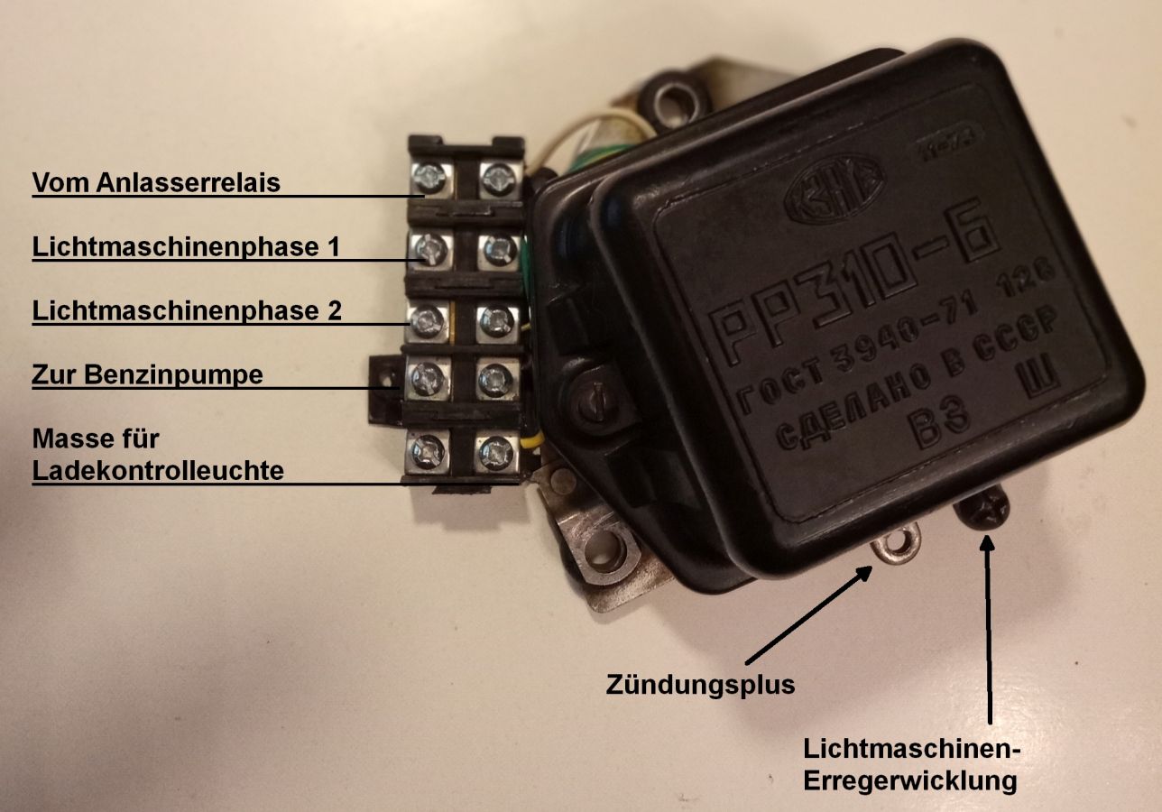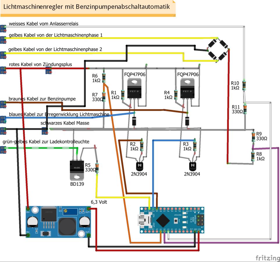 Der Lichtmaschinenregler Die übliche Funktion der Ladekontrollleuchte im Saporoshez ist wie folgt: Die rote Kontrollleuchte stellt eine Verbindung zwischen dem Zündungs-Plus und dem gleichgerichtetem Ausgang der Lichtmaschine her. Wenn die Lichtmaschine keinen Strom liefert, fließt Strom zwischen dem Zündungs-Plus und der Lichtmaschine durch die rote Kontrollleuchte. Die Lichtmaschine verhält sich in diesem Fall wie die Fahrzeugmasse ( Minus ). Wenn die Lichtmaschine im Betrieb Strom liefert, gibt es keine Spannungsdifferenz mehr zwischen Zündung-Plus und der Lichtmaschine. Ohne Spannungsdifferenz leuchtet keine Lampe, die rote Kontrollleuchte ist aus. Die Kontrollleuchte wird also mit Zündungs-Plus versorgt. Verbindet man das Kabel der Kontrollleuchte im Motorraum mit Masse, leuchtet sie bei eingeschalteter Zündung. Im Lichtmaschinenregler mit Benzinpumpenabschaltautomatik im Saporoshez wird die Ladekontrollleuchte über den NPN-Transistor BD139 gegen Masse geschaltet. Wenn die Lichtmaschine keinen Strom liefert, wird der NPN-Transistor BD139 gegen Masse leitend geschaltet und die die Ladekontrollleuchte leuchtet. Wenn die elektrische Benzinpumpe abgeschaltet wird, wird die Ladekontrollleuchte dreimal hintereinander gegen Masse geschaltet, sie leuchtet dann als Warnhinweis dreimal hintereinander. Geschaltet wird der NPN-Transistor BD139 über den PIN11 des Arduino Nano. Der konventionelle Lichtmaschinenregler РР310-Б im Saporoshez funktioniert im Prinzip wie ein Relais, das bei einer Bordspannung von unter 13,8 V bis 14,8 V die Erregerwicklung der Lichtmaschine mit Strom versorgt. Oberhalb einer Bordspannung von 13,8 V bis 14,8 V wird die Erregerwicklung stromlos geschaltet. Da im normalen Betrieb die Bordspannung häufig um diesen Wert schwankt, schaltet dieses Relais häufig an und aus. Im Lichtmaschinenregler mit Benzinpumpenabschaltautomatik wird die Funktion des Relais elektronisch ersetzt. Der Mosfet FQP47P06 versorgt im Prinzip wie ein PNP Transistor die Erregerwicklung der Lichtmaschine mit Strom. Hier wird im Gegensatz zur Ladekontrollleuchte „Plus“ geschaltet. Da die Digitalpins des Arduino Nano maximal 5V mit 20ma liefern, ist eine so genannte High-Side-Treiber-Schaltung notwendig. Der Mosfet FQP47P06 wird über den Transistor 2N3904 angesteuert, der Transistor 2N3904 ist wiederum mit dem PIN9 des Arduino Nano verbunden. Wie viele andere Mikrocontroller auch kann der Arduino Nano PWM Signale abgeben. Obwohl ein Mikrocontroller eigentlich nur seine Ausgänge ( seine PINs ) an- oder ausschalten kann, kann durch schnelles Ein- und Ausschalten mit unterschiedlichen langen Zeiträumen z.B. eine Leuchte gedimmt werden. Auch der Strom der über den Arduino Nano PIN9 angesteuerten Erregerwicklung kann so angepasst werden. Über einen Spannungsteiler mit zwei Widerständen, 1000 Ω und 330 Ω misst der Arduino Nano am Analogpin A1 die Bordspannung. Liegt die Bordspannung unter 13,51 Volt, wird die PWM Frequenz am PIN9 erhöht, die Erregerwicklung erhält praktisch mehr Strom. Liegt die Bordspannung dann über 13,51 Volt, wird die PWM am PIN9 verringert, die Erregerwicklung erhält praktisch weniger Strom. 2. Die Benzinpumpenabschaltautomatik Elektrische Benzinpumpen haben im Gegensatz zu mechanischen, vom Motor angetriebenen Benzinpumpen den Vorteil, dass sie unabhängig von der Motordrehzahl stets die gleiche Menge Benzin fördern. Vor dem Starten des Motors kann damit bereits die Schwimmerkammer des Vergasers gefüllt werden. Auch im Leerlauf ist immer genügend Benzin im Vergaser vorhanden. Der Nachteil der elektrischen Benzinpumpe ist jedoch, dass auch bei einem plötzlichem Stillstand des Motors das Benzin weiter gefördert wird. Die Benzinpumpenabschaltautomatik sorgt nun dafür, dass – mit einer Ausnahme – die elektrische Benzinpumpe nur Strom erhält, wenn der Motor läuft. Die elektrische Benzinpumpe hätte man über ein Relais ansteuern können. Statt einem Relais wird genau wie bei der Ansteuerung der Erregerwicklung ebenfalls ein High-Side-Mosfet FQP47P06 verwendet. Dieser zweite Mosfet FQP47P06 wird vom Arduino-Pin 10 angesteuert. Beim Saporoshez wird mit Kabeln aus der Lichtmaschine nicht nur das gleichgerichtete PLUS zum Laden der Batterie geführt, sondern auch für die Funktion des Anlasserverriegelungsrelais auch zwei Phasen der Drehstromlichtmaschine. An diesen beiden Phasen liegt nur Spannung an, wenn sich die Lichtmaschine dreht. Die Lichtmaschine dreht sich nur, wenn der Motor nicht stillsteht. Hierdurch im kann für den Lichtmaschinenregler mit Benzinpumpenabschaltautomatik gemessen werden, ob sich die Lichtmaschine und damit der Motor dreht. Die beiden Phasen der Lichtmaschine werden über 4 Dioden gleichgerichtet, die Spannung wird über den üblichen Spannungsteiler mit zwei Widerständen 1000 Ω und 330 Ω verringert und anschließend über den Analogpin 3 des Arduino Nano gemessen. Der im Arduin Nano realisierte Lichtmaschinenregler mit Benzinpumpenabschaltautomatik wird mit Zündungs-Plus mit Spannung versorgt, wobei ein Step-Down Wandler zum Herausfiltern von Spannungsspitzen zuerst die Spannung auf etwa 6,3 Volt senkt. Diese 6,3 Volt gehen in den Eingang VIN des Arduino Nano. Jedes Mal, wenn im Saporoshez die Zündung am Zündschloss ein- und ausgeschaltet wird, startet der Lichtmaschinenregler mit Benzinpumpenabschaltautomatik neu. Zur Messung, ob der Anlasser betätigt wird, ist das Kabel vom Anlasserrelais mit dem üblichen Spannungsteiler mit zwei Widerständen 1000 Ω und 330 Ω mit dem Analogpin 3 des Arduino Nano verbunden. Hierdurch kann im Arduino Nano gemessen werden, ob der Anlasser betätigt wird. Nach jedem neuen Einschalten der Zündung und damit jedem neuen Starten des Lichtmaschinenreglers mit Benzinpumpenabschaltautomatik wird die Benzinpumpe für 15 Sekunden mit Strom versorgt. Und dies unabhängig davon, ob der Motor läuft. Ebenfalls wird nach jedem ( auch noch so kurzem ) Betätigen des Anlassers die Benzinpumpe f