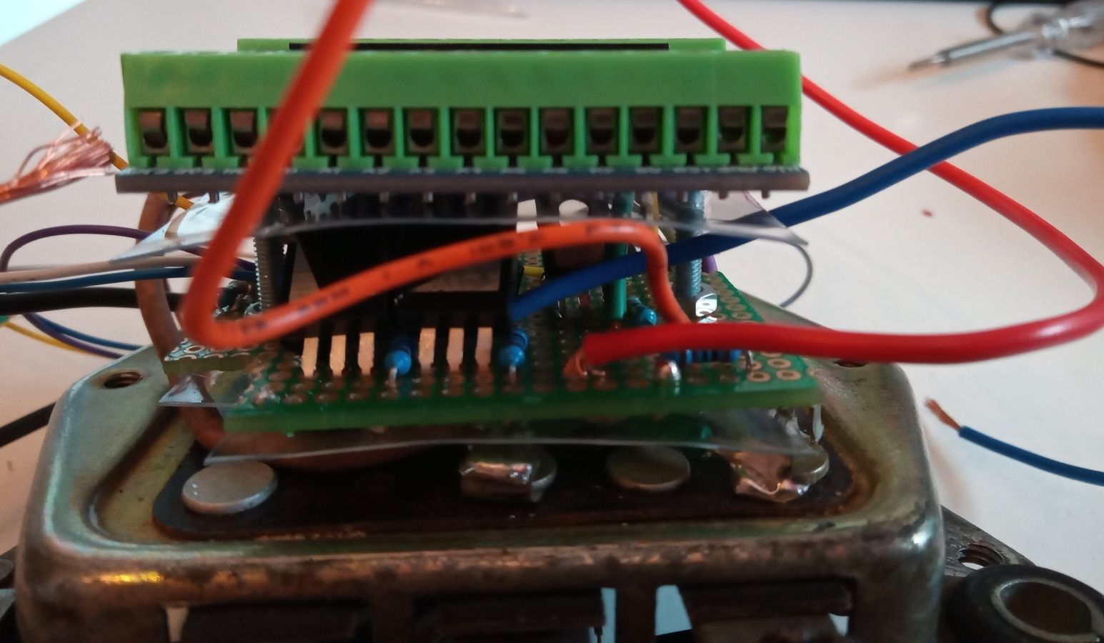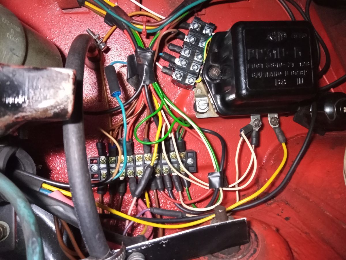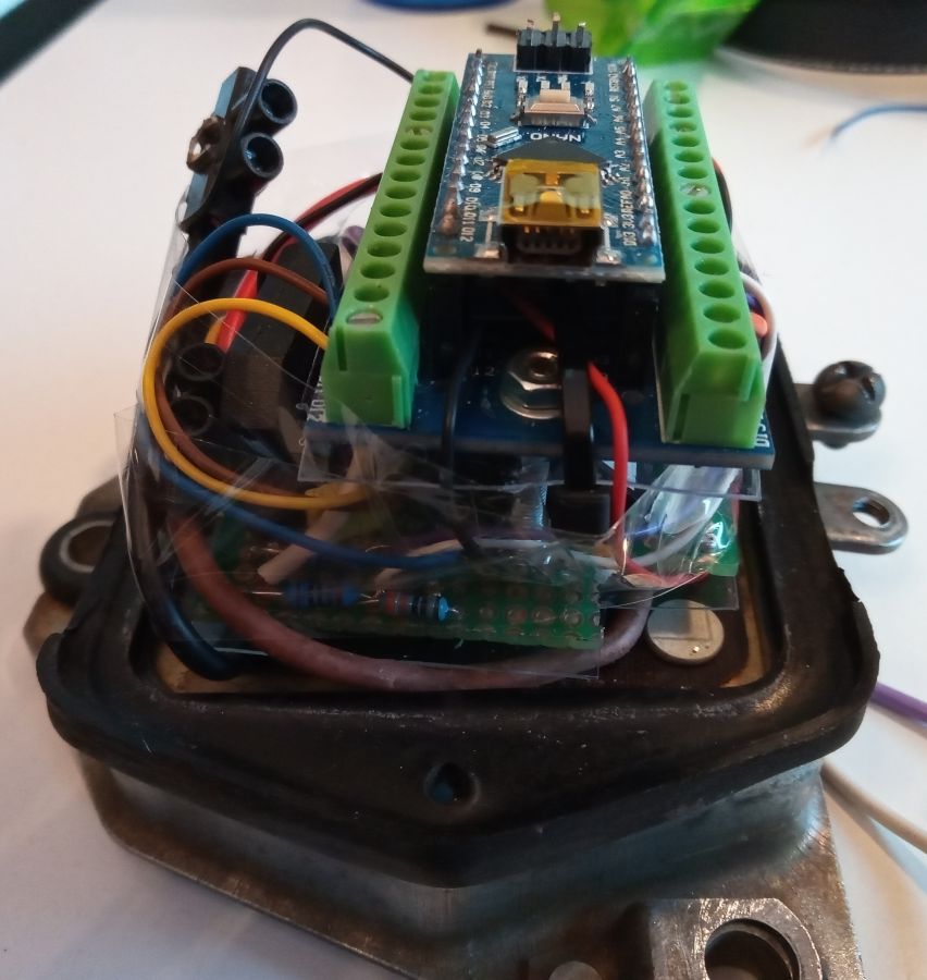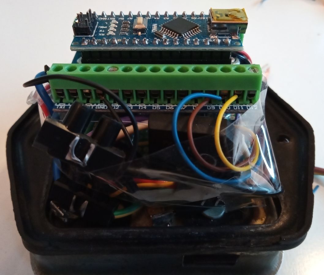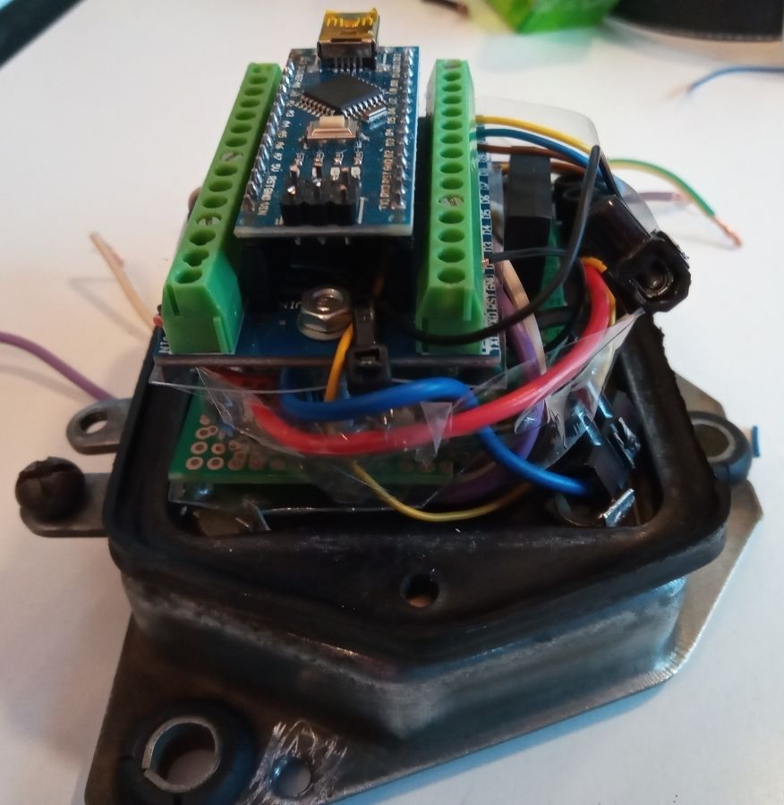 Der Lichtmaschinenregler Die übliche Funktion der Ladekontrollleuchte im Saporoshez ist wie folgt: Die rote Kontrollleuchte stellt eine Verbindung zwischen dem Zündungs-Plus und dem gleichgerichtetem Ausgang der Lichtmaschine her. Wenn die Lichtmaschine keinen Strom liefert, fließt Strom zwischen dem Zündungs-Plus und der Lichtmaschine durch die rote Kontrollleuchte. Die Lichtmaschine verhält sich in diesem Fall wie die Fahrzeugmasse ( Minus ). Wenn die Lichtmaschine im Betrieb Strom liefert, gibt es keine Spannungsdifferenz mehr zwischen Zündung-Plus und der Lichtmaschine. Ohne Spannungsdifferenz leuchtet keine Lampe, die rote Kontrollleuchte ist aus. Die Kontrollleuchte wird also mit Zündungs-Plus versorgt. Verbindet man das Kabel der Kontrollleuchte im Motorraum mit Masse, leuchtet sie bei eingeschalteter Zündung. Im Lichtmaschinenregler mit Benzinpumpenabschaltautomatik im Saporoshez wird die Ladekontrollleuchte über den NPN-Transistor BD139 gegen Masse geschaltet. Wenn die Lichtmaschine keinen Strom liefert, wird der NPN-Transistor BD139 gegen Masse leitend geschaltet und die die Ladekontrollleuchte leuchtet. Wenn die elektrische Benzinpumpe abgeschaltet wird, wird die Ladekontrollleuchte dreimal hintereinander gegen Masse geschaltet, sie leuchtet dann als Warnhinweis dreimal hintereinander. Geschaltet wird der NPN-Transistor BD139 über den PIN11 des Arduino Nano. Der konventionelle Lichtmaschinenregler РР310-Б im Saporoshez funktioniert im Prinzip wie ein Relais, das bei einer Bordspannung von unter 13,8 V bis 14,8 V die Erregerwicklung der Lichtmaschine mit Strom versorgt. Oberhalb einer Bordspannung von 13,8 V bis 14,8 V wird die Erregerwicklung stromlos geschaltet. Da im normalen Betrieb die Bordspannung häufig um diesen Wert schwankt, schaltet dieses Relais häufig an und aus. Im Lichtmaschinenregler mit Benzinpumpenabschaltautomatik wird die Funktion des Relais elektronisch ersetzt. Der Mosfet FQP47P06 versorgt im Prinzip wie ein PNP Transistor die Erregerwicklung der Lichtmaschine mit Strom. Hier wird im Gegensatz zur Ladekontrollleuchte „Plus“ geschaltet. Da die Digitalpins des Arduino Nano maximal 5V mit 20ma liefern, ist eine so genannte High-Side-Treiber-Schaltung notwendig. Der Mosfet FQP47P06 wird über den Transistor 2N3904 angesteuert, der Transistor 2N3904 ist wiederum mit dem PIN9 des Arduino Nano verbunden. Wie viele andere Mikrocontroller auch kann der Arduino Nano PWM Signale abgeben. Obwohl ein Mikrocontroller eigentlich nur seine Ausgänge ( seine PINs ) an- oder ausschalten kann, kann durch schnelles Ein- und Ausschalten mit unterschiedlichen langen Zeiträumen z.B. eine Leuchte gedimmt werden. Auch der Strom der über den Arduino Nano PIN9 angesteuerten Erregerwicklung kann so angepasst werden. Über einen Spannungsteiler mit zwei Widerständen, 1000 Ω und 330 Ω misst der Arduino Nano am Analogpin A1 die Bordspannung. Liegt die Bordspannung unter 13,51 Volt, wird die PWM Frequenz am PIN9 erhöht, die Erregerwicklung erhält praktisch mehr Strom. Liegt die Bordspannung dann über 13,51 Volt, wird die PWM am PIN9 verringert, die Erregerwicklung erhält praktisch weniger Strom. 2. Die Benzinpumpenabschaltautomatik Elektrische Benzinpumpen haben im Gegensatz zu mechanischen, vom Motor angetriebenen Benzinpumpen den Vorteil, dass sie unabhängig von der Motordrehzahl stets die gleiche Menge Benzin fördern. Vor dem Starten des Motors kann damit bereits die Schwimmerkammer des Vergasers gefüllt werden. Auch im Leerlauf ist immer genügend Benzin im Vergaser vorhanden. Der Nachteil der elektrischen Benzinpumpe ist jedoch, dass auch bei einem plötzlichem Stillstand des Motors das Benzin weiter gefördert wird. Die Benzinpumpenabschaltautomatik sorgt nun dafür, dass – mit einer Ausnahme – die elektrische Benzinpumpe nur Strom erhält, wenn der Motor läuft. Die elektrische Benzinpumpe hätte man über ein Relais ansteuern können. Statt einem Relais wird genau wie bei der Ansteuerung der Erregerwicklung ebenfalls ein High-Side-Mosfet FQP47P06 verwendet. Dieser zweite Mosfet FQP47P06 wird vom Arduino-Pin 10 angesteuert. Beim Saporoshez wird mit Kabeln aus der Lichtmaschine nicht nur das gleichgerichtete PLUS zum Laden der Batterie geführt, sondern auch für die Funktion des Anlasserverriegelungsrelais auch zwei Phasen der Drehstromlichtmaschine. An diesen beiden Phasen liegt nur Spannung an, wenn sich die Lichtmaschine dreht. Die Lichtmaschine dreht sich nur, wenn der Motor nicht stillsteht. Hierdurch im kann für den Lichtmaschinenregler mit Benzinpumpenabschaltautomatik gemessen werden, ob sich die Lichtmaschine und damit der Motor dreht. Die beiden Phasen der Lichtmaschine werden über 4 Dioden gleichgerichtet, die Spannung wird über den üblichen Spannungsteiler mit zwei Widerständen 1000 Ω und 330 Ω verringert und anschließend über den Analogpin 3 des Arduino Nano gemessen. Der im Arduin Nano realisierte Lichtmaschinenregler mit Benzinpumpenabschaltautomatik wird mit Zündungs-Plus mit Spannung versorgt, wobei ein Step-Down Wandler zum Herausfiltern von Spannungsspitzen zuerst die Spannung auf etwa 6,3 Volt senkt. Diese 6,3 Volt gehen in den Eingang VIN des Arduino Nano. Jedes Mal, wenn im Saporoshez die Zündung am Zündschloss ein- und ausgeschaltet wird, startet der Lichtmaschinenregler mit Benzinpumpenabschaltautomatik neu. Zur Messung, ob der Anlasser betätigt wird, ist das Kabel vom Anlasserrelais mit dem üblichen Spannungsteiler mit zwei Widerständen 1000 Ω und 330 Ω mit dem Analogpin 3 des Arduino Nano verbunden. Hierdurch kann im Arduino Nano gemessen werden, ob der Anlasser betätigt wird. Nach jedem neuen Einschalten der Zündung und damit jedem neuen Starten des Lichtmaschinenreglers mit Benzinpumpenabschaltautomatik wird die Benzinpumpe für 15 Sekunden mit Strom versorgt. Und dies unabhängig davon, ob der Motor läuft. Ebenfalls wird nach jedem ( auch noch so kurzem ) Betätigen des Anlassers die Benzinpumpe f